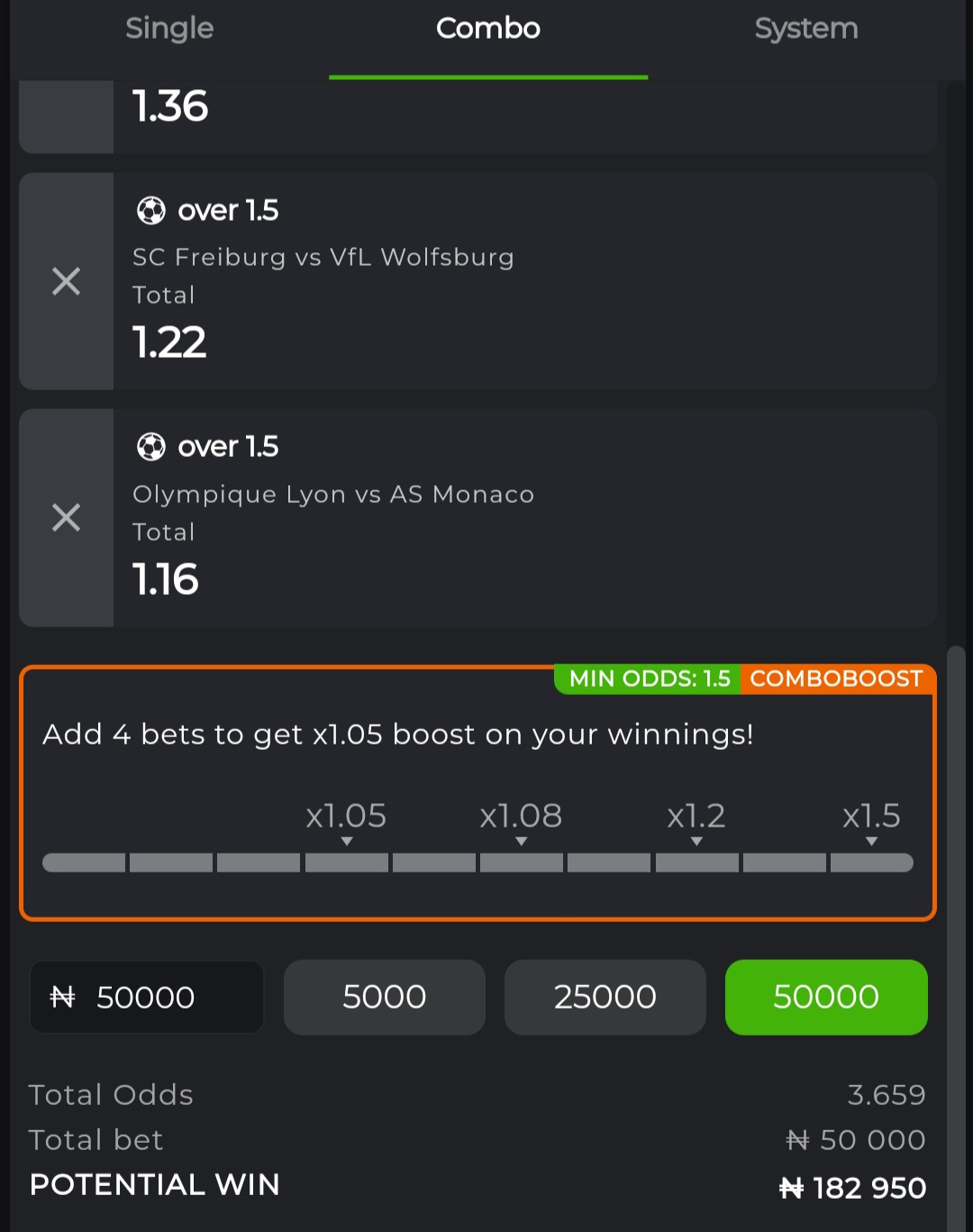 - Combo bets (accumulators). This is comprised of more than one independent outcome from different events. All the selected outcomes shall be correct for one to win, and in their case where one of them is not correct, it shall make the bet lose. The winnings shall represent the stake multiplied by the combined odds of all events in the combo.