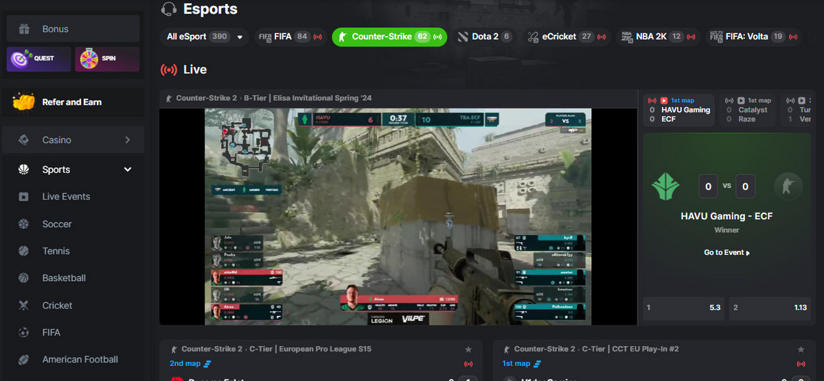 - Comprehensive bet types. Users can engage in a variety of bets such as match winner, total score, map-specific outcomes, and in-play actions like the first team to achieve a certain objective in-game. This range caters to both novice and experienced bettors.
