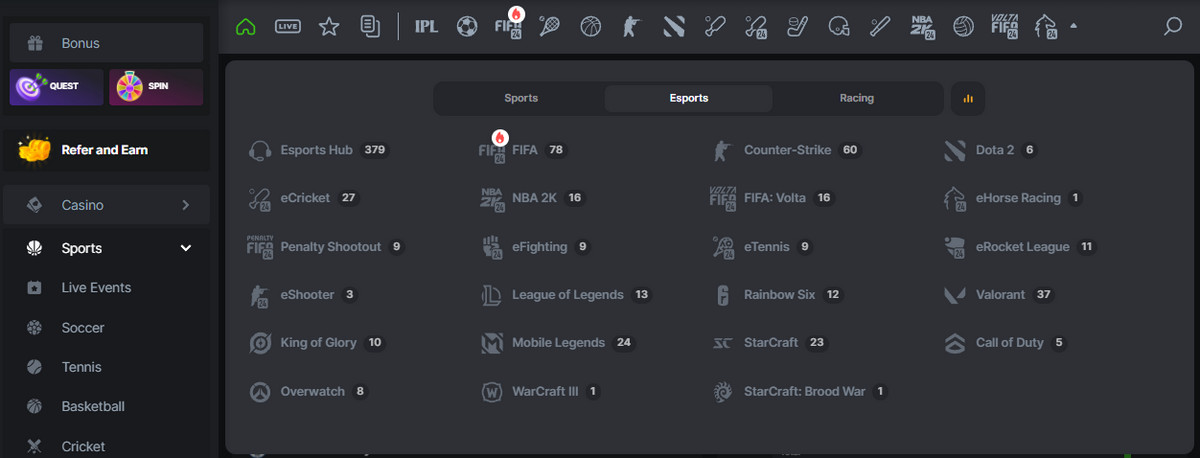 - Click on to get the full menu of all the games available, followed by their tournaments. You may check the games available, such as Dota 2, CS:GO, League of Legends, etc.