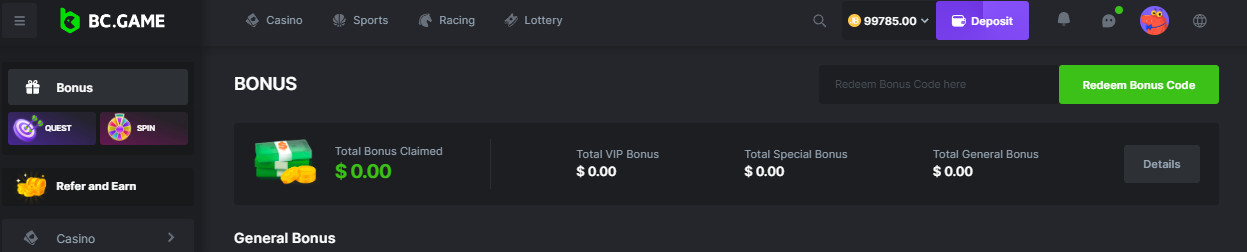 - Navigating to bonus section. After logging into your BC.Game account, locate the “Bonus” option within the site’s sidebar menu. This section is your gateway to activating promotional codes manually.