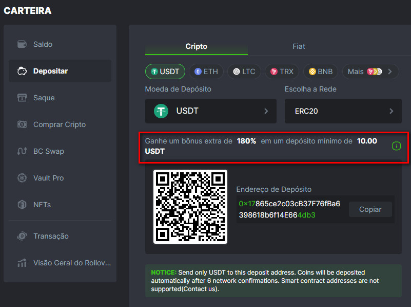 - Magdeposito. Ang BC.Game ay maglalabas ng isang address na natatanging nabuo batay sa kung anong uri ng deposito ang ginagawa. Kung ikaw ay nasa iyong desktop, i-paste ang address na iyon sa iyong crypto wallet sa ilalim ng “tatanggap”. Kung ginagawa mo ito gamit ang isang mobile device, i-scan ang QR code gamit ang iyong Wallet App upang ang deposit address ay awtomatikong mag-populate.
