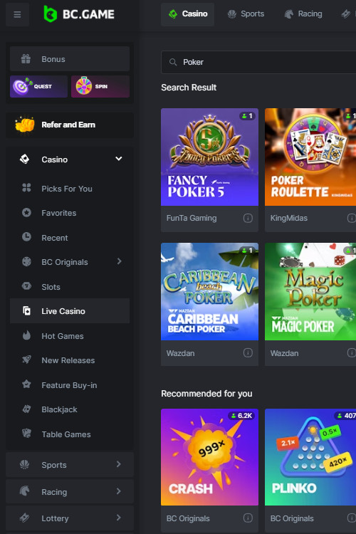 Sa BC.Game, ang isang manlalaro ay magkakaroon ng malawak na iba’t ibang mga laro ng Live Poker, mga panuntunang nakabatay sa bahay, at ilang kahanga-hangang karanasan sa gameplay. Ang lahat ng mga laro ay magbibigay sa bawat player ng isang ganap na iba’t ibang paraan ng nakakaranas poker, na kung saan ay pinasadya para sa iba’t-ibang mga kagustuhan at mga estratehiya sa pamamagitan ng mga manlalaro sa isang live na format kung saan ang kaguluhan ay tumatagal sa ibabaw ng player sa isang aktwal na casino kapaligiran.