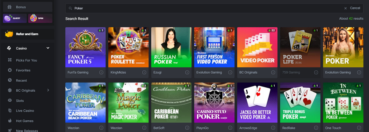 Ang dalawang pinakamalaking kumpanya ng live casino entertainment sa mundo, Evolution Gaming at Ezugi, ay ang pangunahing pandaigdigang provider para sa mga live na laro ng poker sa BC.Game. Ang mga ito ay kilala at iginagalang sa buong mundo para sa pag-aalok ng top-tier na live na mga platform ng dealer at pagtataguyod ng mga makabagong diskarte sa mga online na laro sa casino.