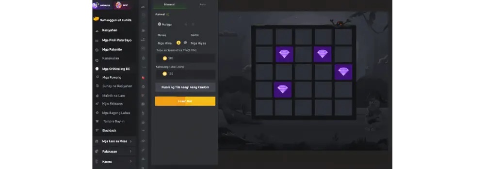 - Naghahanap . Kung gusto mong maghanap para sa laro nang mas direkta, maaari mo itong ilagay sa search bar ng seksyon ng casino. I-type lamang ang “Mines” sa search bar at pindutin ang enter.