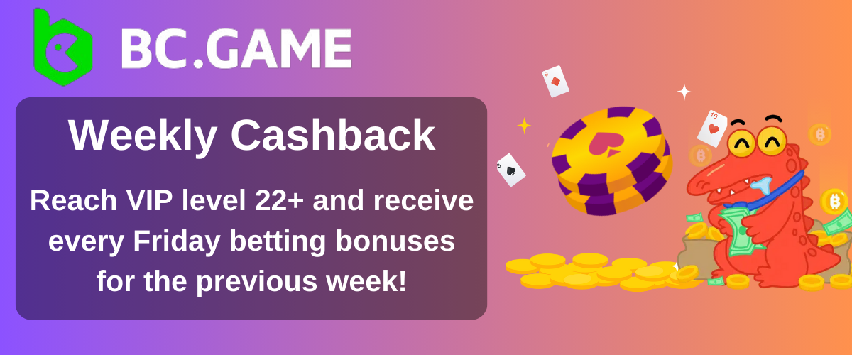 - Dispensed every Friday, the Weekly Bonus automatically benefits players who have reached the VIP level 22 threshold or higher, cementing its role as a token of gratitude towards the most engaged and committed players within the BC.Game community.